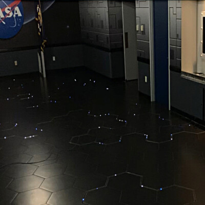 The Universe Theater Lobby at Kennedy Space Center displays an intriguing twist of technology with its unique hexagon floors and light trails with the help of Impact Lighting and smart LED controllers.