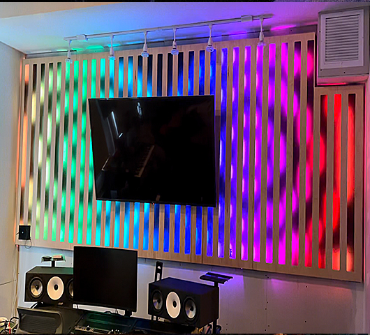 To put it simply… this custom animated wall is on fire. This is another part of a custom recording studio project that we dove into headfirst with maximum impact on our minds. Our design and lighting engineers collaborated with our fabrication gurus resulting in a one-of-a kind immersive environment that will forever put out an ever-changing vibe.