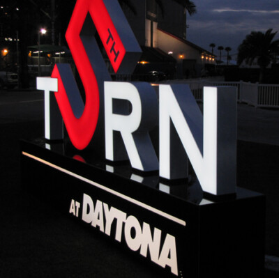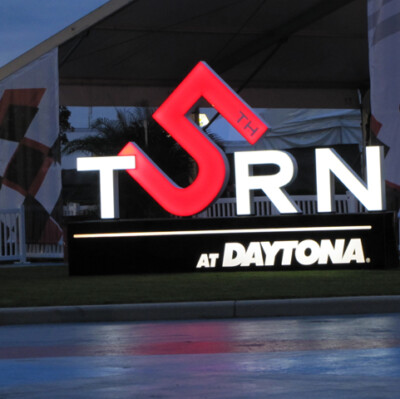 Custom fabricated signage for Daytona Speedway’s 5th Turn is an iconic project for Impact Lighting. Brushed Aluminum, acrylic and super bright LED lighting make up this large free standing signage.