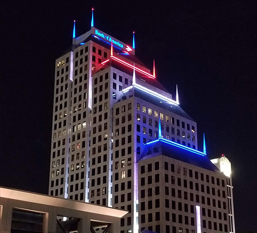 Thanks to the vision of Impact Lightingās design team and the fearless installers who repelled the massive buildings walls, Orlandoās Bank of America building will continue to highlight The City Beautiful skyline making it a unique focal point for many years to come.