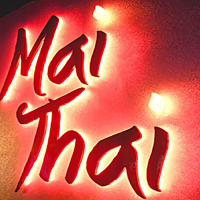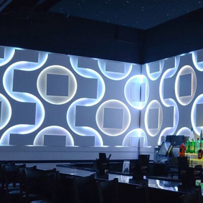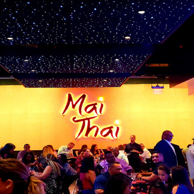 Mai Thai’s interior décor was heavily focused on next to the Asian Fusion menu. With a very specific vision, Impact Lighting’s designers and fabricators were in conjunct collaboration with the owners, creating each piece of décor to suit their daytime crowd as well as attracting a night time lounge crowd. Lighted acrylic furniture and galaxy walls and star ceiling panels bring this establishments interior appeal to a next level. Large logo signage cut from a high sheen black acrylic, back lit with our ThinGlow™ controllable LED light strips and highlighted by special routed etched 3d acrylic flame tips. Glowing color changing nightclub tables set the nightclub theme while custom star ceiling panels give an infinity night sky effect.